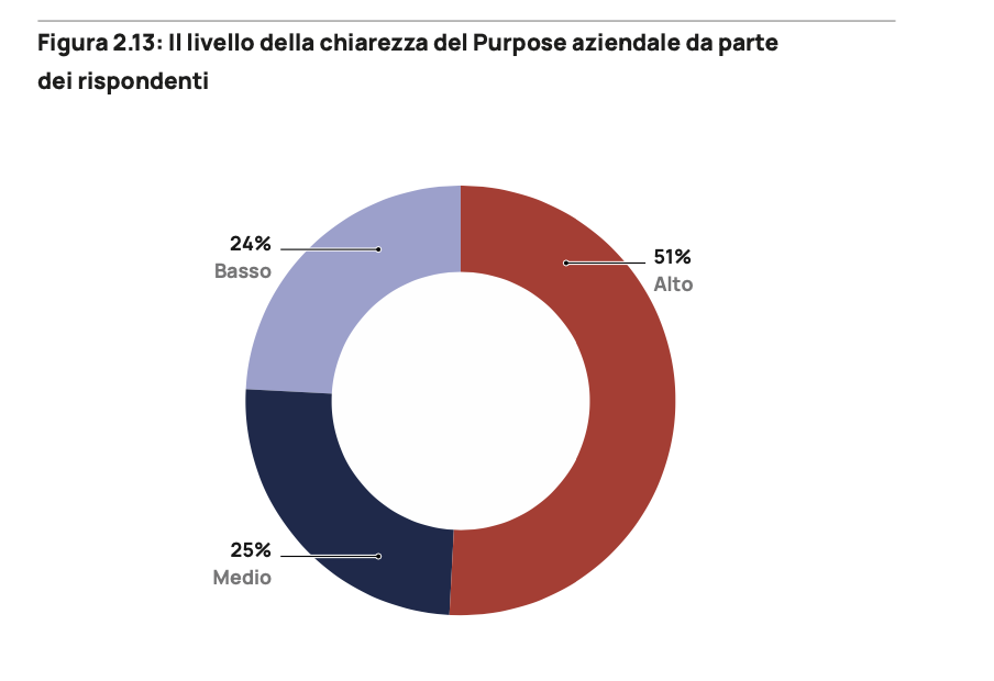 Supera di solo un punto percentuale la metà del campione intervistato la quota di rispondenti che sa indicare con chiarezza quale sia il purpose nell’organizzazione. Allo stesso modo, ben il 40% fatica a distinguerlo da altri elementi identitari come la visione dell’impresa o la sua mission.